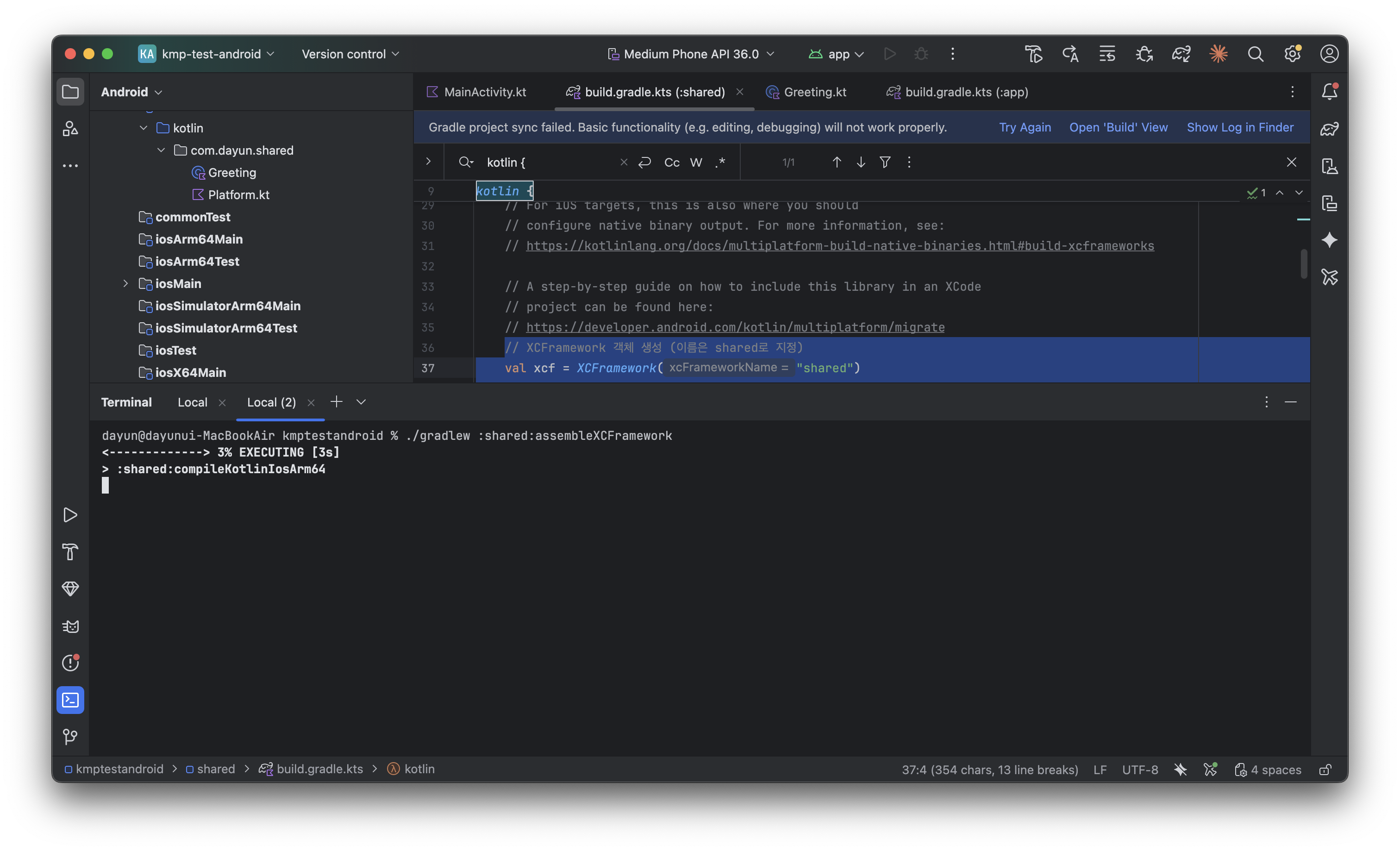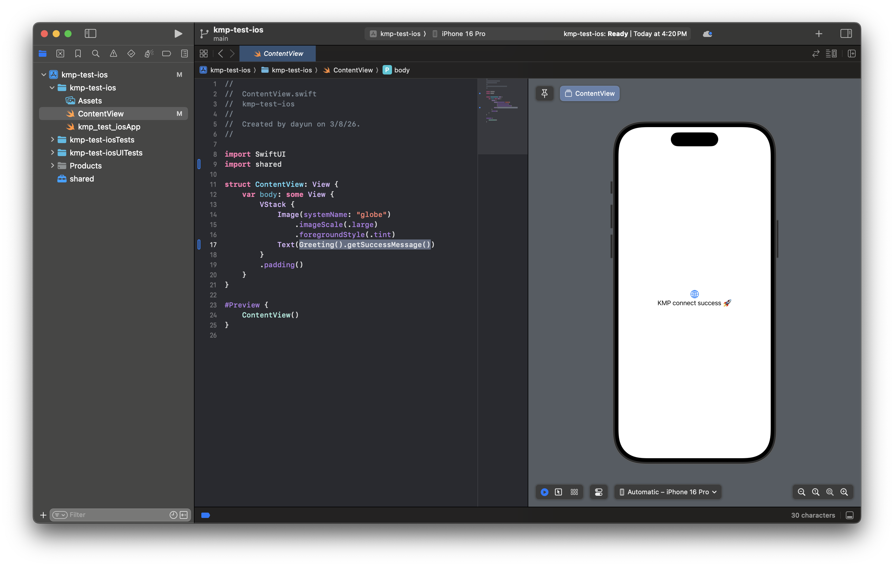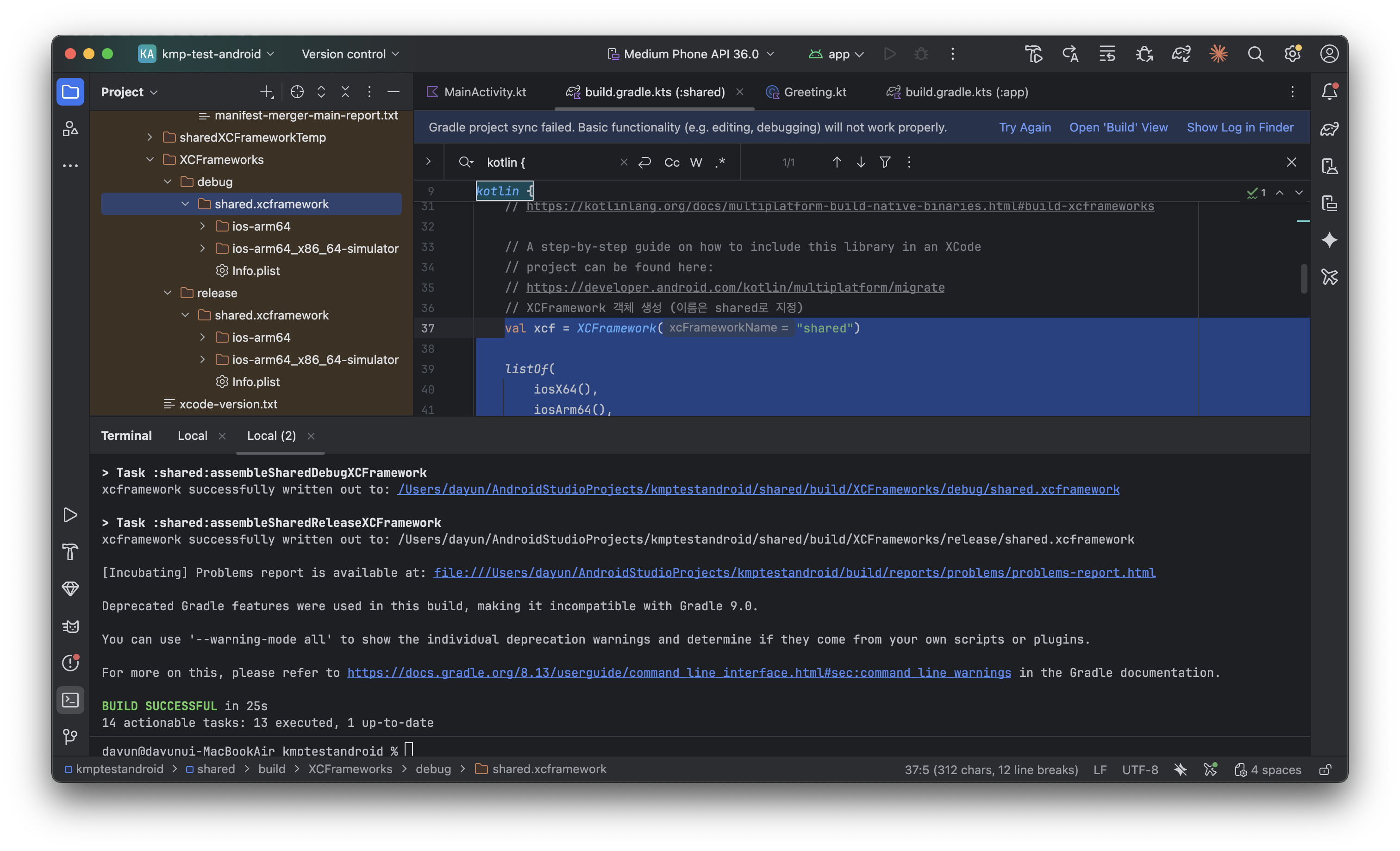빌드가 생성되고 XCFramworks 폴더에 shared.xcframwork가 생긴걸 볼 수 있습니다.